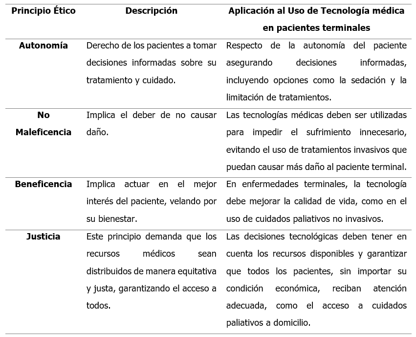 La siguiente tabla resume los principios éticos aplicados al uso de tecnologías médicas en pacientes terminales, tomando en cuenta las perspectivas de diversos estudios y autores; estos principios sirven como guía para asegurar que las intervenciones tecnológicas respeten los derechos de los pacientes y se alineen con su bienestar general.