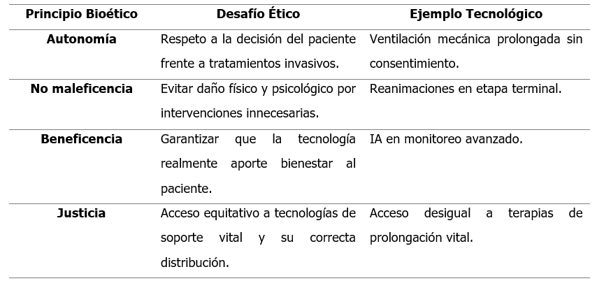 La tabla a continuación presenta los principales desafíos éticos en la implementación de tecnologías para prolongar la vida en pacientes terminales, basada en los principios bioéticos. Esta tabla se ha construido a partir de diversas fuentes clave que abordan la ética médica y la tecnología.