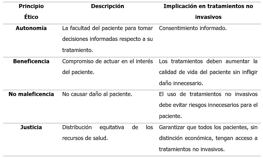 La siguiente tabla resume los principios éticos aplicados al uso de tratamientos no invasivos en pacientes terminales, basados en los aportes de diversos estudios clave. Estos principios guían la implementación de tecnologías médicas para garantizar el respeto a los derechos y el bienestar de los pacientes.