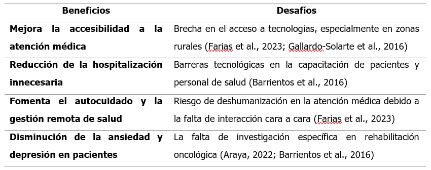La incorporación de TICs en la atención de los pacientes con enfermedades terminales ha mostrado beneficios importantes, tales como la reducción de ingresos innecesarios a hospitales, la disminución de la ansiedad y depresión de las personas, y una mejora en el bienestar. Los pacientes en cuestión pueden recibir atención desde sus hogares, lo que facilita el acceso a cuidados paliativos y disminuye el dolor asociado con traslados físicos frecuentes (Farias et al., 2023; Gallardo et al., 2016).