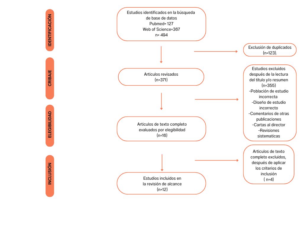 Se identificaron 494 estudios para revisión del título, tras la revisión del título quedaron 55 artículos. Una vez revisados los resúmenes se incluyeron 16 artículos para revisión del texto completo, de los cuales 4 fueron excluidos tras aplicar los criterios de exclusión, resultando 12 artículos finales para incluir en nuestra revisión de alcance. El detalle del proceso de selección de los estudios incluidos se muestra gráficamente en el siguiente diagrama de flujo (Figura 1).
