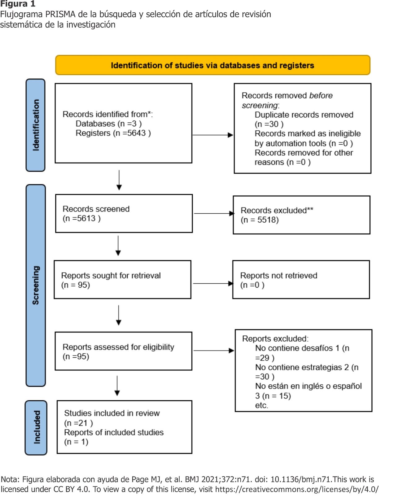 Para la extracción de datos se diseñaron matrices estandarizadas en Excel, que incluyeron las siguientes variables: autores, año, objetivo, bases de datos consultadas, número de estudios primarios incluidos, nivel educativo focalizado, principales desafíos identificados, estrategias propuestas y limitaciones reportadas. El análisis de los datos siguió un enfoque de síntesis temática y comparativa.