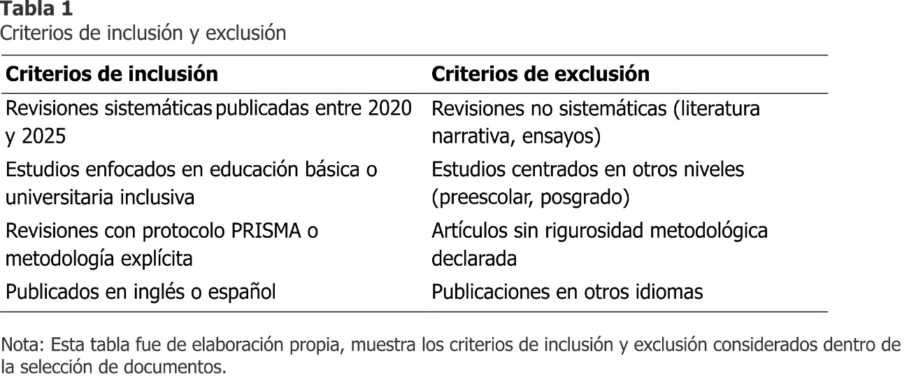 El diseño de investigación es de tipo documental. La unidad de análisis son revisiones sistemáticas de la literatura sobre educación inclusiva. La muestra estuvo limitado a estudios realizados en los niveles educativos básico y universitario, publicados en el periodo comprendido entre enero 2020 a julio del 2025. La búsqueda de las revisiones sistemáticas pertinentes para el estudio se realizó en tres bases de datos (ERIC, Web of Science y Scopus) mediante palabras claves y operadores booleanos. La fórmula de búsqueda utilizada de manera general en las tres bases de datos fue: (“inclusive education” AND (“systematic review” OR review)) en el campo de búsqueda “Título de la fuente”. Esta fórmula se adaptó a la sintaxis específica de cada base de datos. Además, la estrategia se complementó con una búsqueda manual en las listas de referencias de los estudios incluidos, con el fin de identificar revisiones adicionales relevantes.